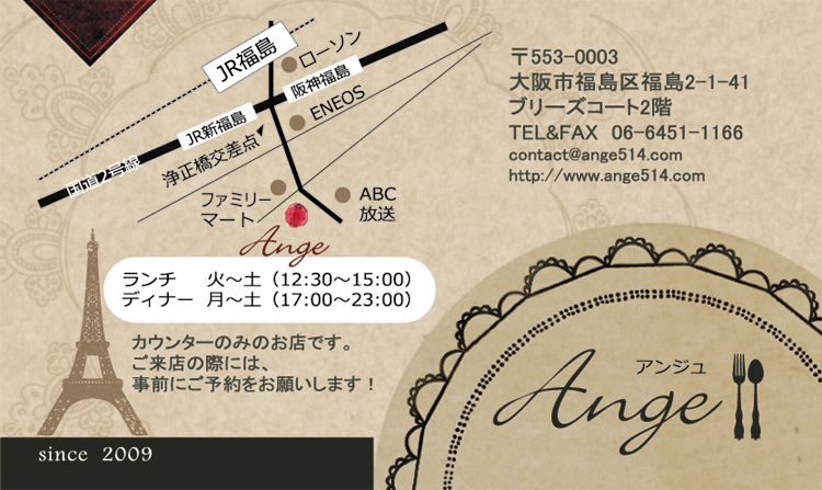 ●ランチ:火〜土(12:30〜15:00) ディナー:月〜土(17:00〜23:00)